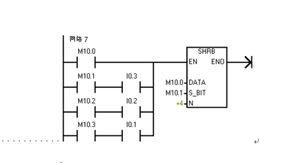 左邊輸入條件滿足時,將M10.0的狀態(tài)移入M10.1為首的四位連續(xù)地址中,輸入應(yīng)該要用邊沿指令