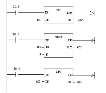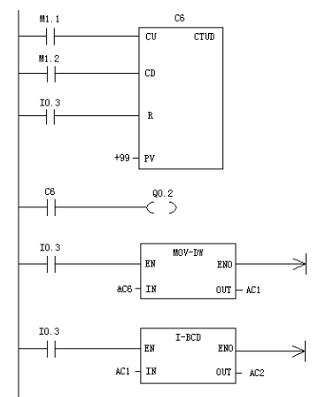 C6之后的程序好像是將C6中計數(shù)值(0~99)用QB1、QB2顯示出來(但是也要用到*AC1將C6的值取出來)。能顯示兩位數(shù)。但I(xiàn)0.3同時又將C6復(fù)位了……