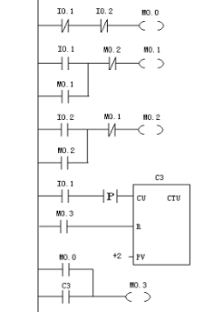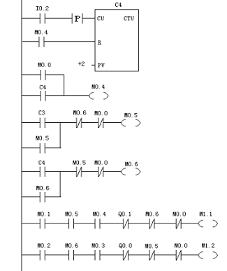 C6以上是正、反計數(shù)用。動作流程比較奇怪。I0.1先On則C6只能加,I0.2先On則C6只能減。加的時候動作順序只能是:(1)I0,1 ON (2)I0.2 ON (3)I0,1 ON (4)I0,2 ON 此時C6為1 。以后I0.2每ON兩次C6數(shù)值加1 。