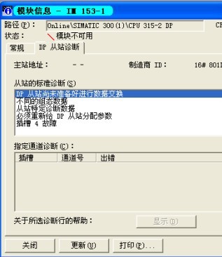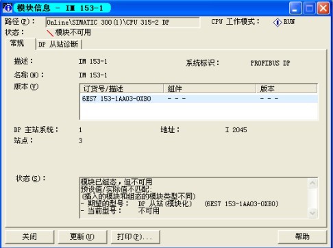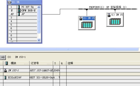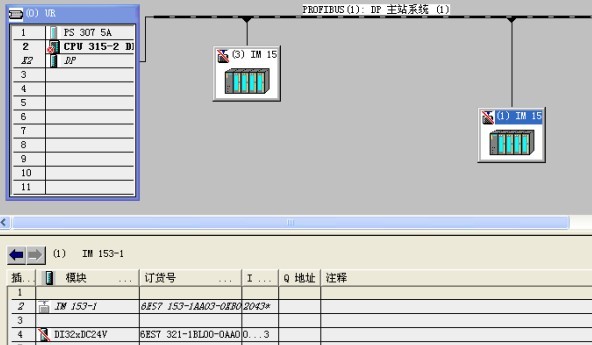 ,組態(tài)后進(jìn)入硬件,然后進(jìn)行ET200遠(yuǎn)程站的組態(tài),主站地址為2,兩個(gè)從站地址分別為1和3,波特率為187.5,因?yàn)榭盏腎M153不能下載,所以小弟在兩個(gè)分站分別加了一個(gè)32點(diǎn)的DI模塊,但其實(shí)小弟的硬件是沒(méi)有這兩個(gè)模塊的,緊接著小弟就開(kāi)始在線診斷了,診斷結(jié)果如圖