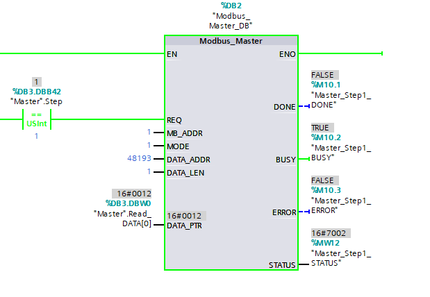 主站命令Modbus_Master的使能EN和REQ應為同一觸點,REQ還應加沿信號。