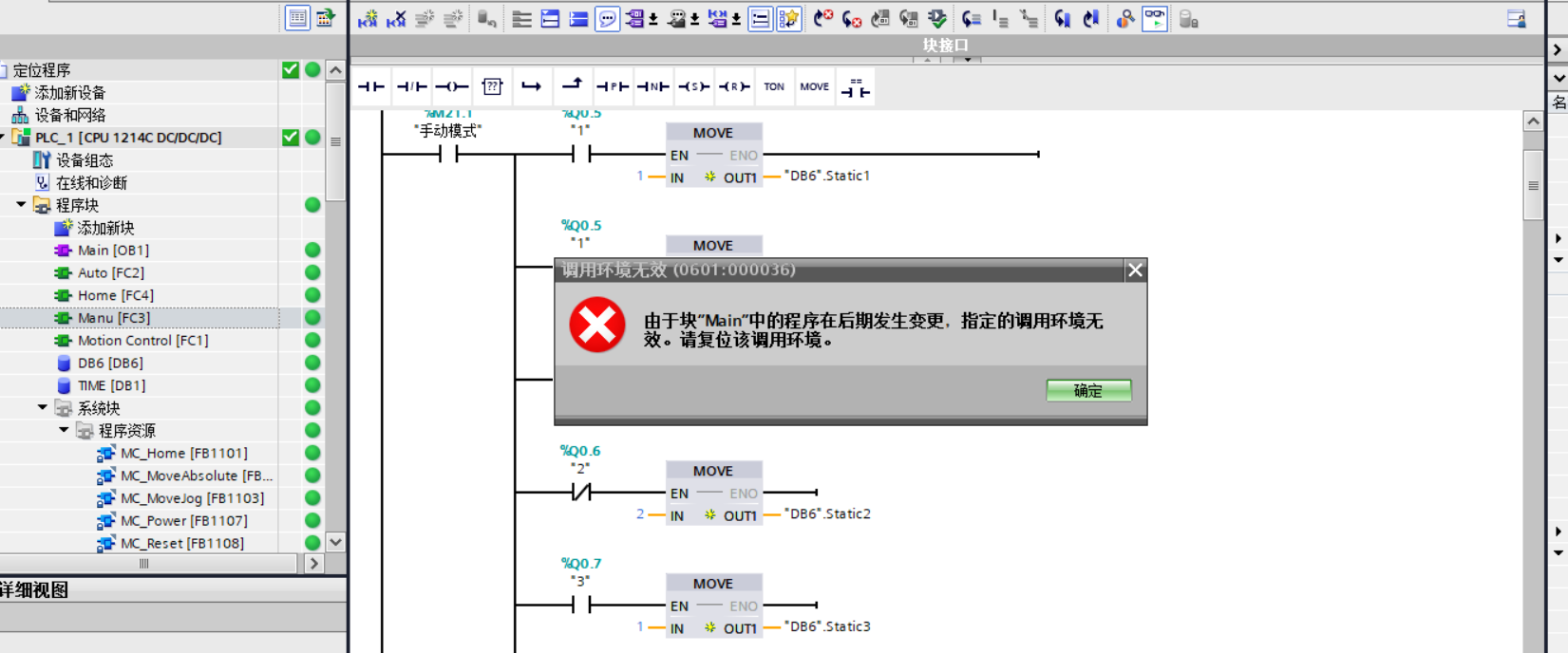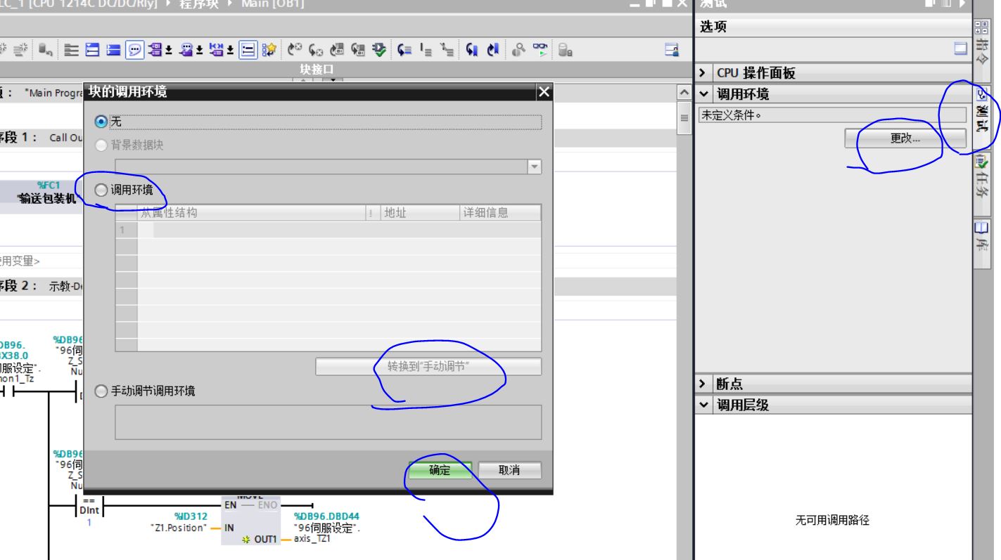 出現(xiàn)這種情況一般是由于被調(diào)用的FB,FC塊內(nèi)有改動發(fā)生了變化,這時應該單擊測試,在調(diào)用環(huán)境一欄選擇更改,彈出的畫面選擇調(diào)用環(huán)境,在列表下找到出現(xiàn)問題的FB,F(xiàn)C,單擊轉到手動調(diào)節(jié),OK了