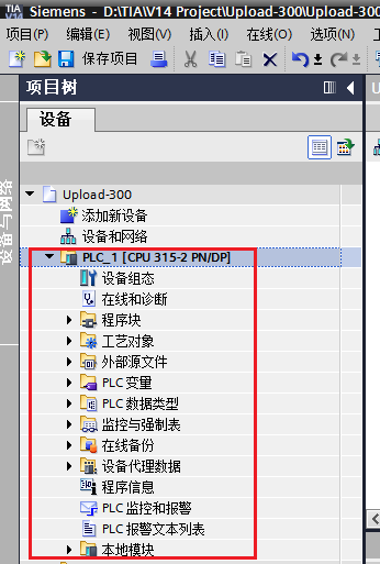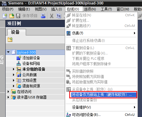 打開Portal V15,創(chuàng)建項(xiàng)目比如“Upload-300”。在項(xiàng)目樹中選擇項(xiàng)目名稱,在“在線”(Online) 菜單中,選擇“作為新站上傳設(shè)備(硬件和軟件)”(Upload device as new station (hardware and software))。