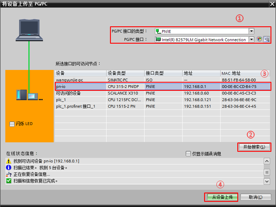 “將設(shè)備上傳到 PG/PC”(Upload device to PG/PC) 對(duì)話框隨即打開。
