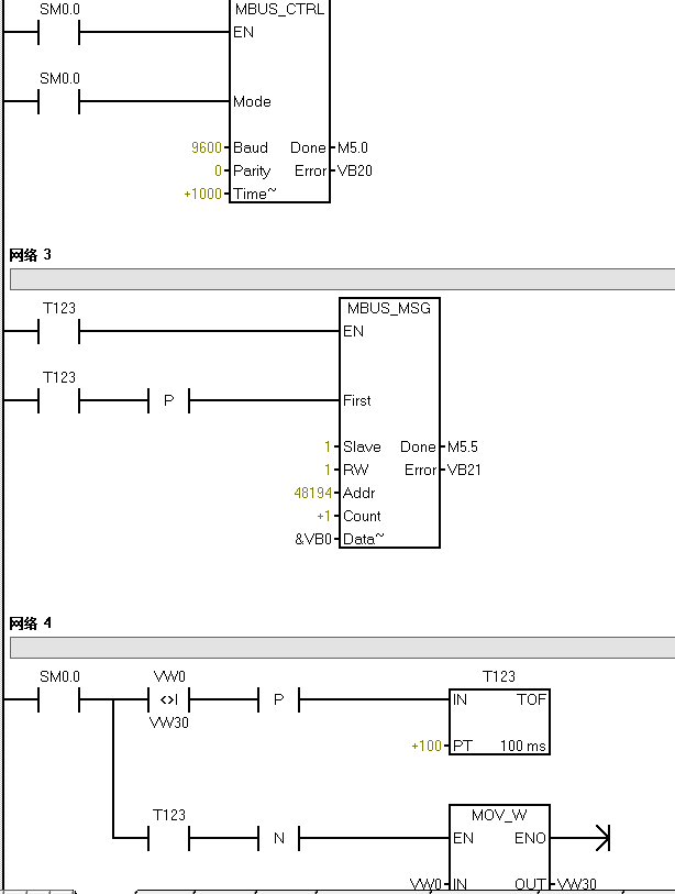 一臺(tái)機(jī)器用西門子S200 與2臺(tái)英威騰GD200系列變頻器通訊,只設(shè)置頻率,運(yùn)行由端子控制。程序與大家分享,也有些疑問:網(wǎng)絡(luò)3中,Addr 不是設(shè)置變頻器頻率(H2001)的地止嗎?!48194是什么意思呢? &VB4是什么意思呢?怎么有一個(gè)&?網(wǎng)絡(luò)4中,VW0不等于VW30時(shí),斷開T123,從而保存新的設(shè)置數(shù)據(jù)。但是T123前面延長(zhǎng)會(huì)有一個(gè)上升沿信號(hào)呢?5里面還有一個(gè)子程序,里面是加了密還是自動(dòng)生成的一個(gè)文件呢,怎么沒有內(nèi)容提要呢?