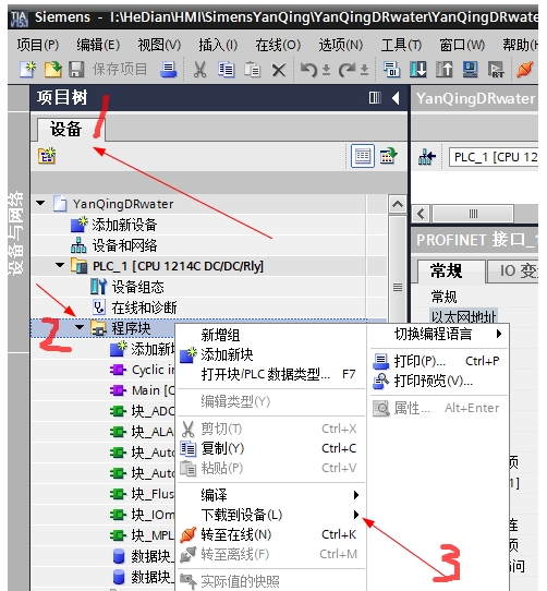 然后, 在博圖軟件打開程序后 ,點左側(cè)的項目樹,程序塊,右鍵,下載到設備-----軟件。