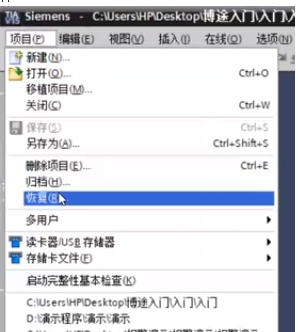 打開:打開博圖v16軟件——左下角——點 項目視圖——進去后點左上角菜單——項目——下拉菜單——恢復——選擇路徑,找到附件的 zap15_1的文件