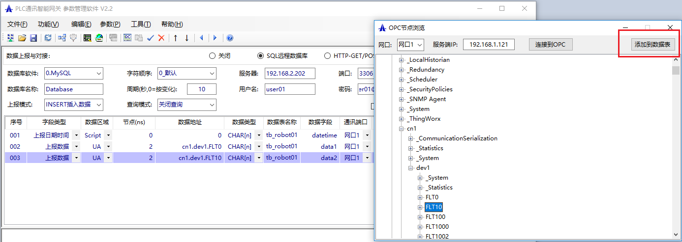 首先,通過(guò)網(wǎng)關(guān)的參數(shù)設(shè)置軟件設(shè)置IP地址、OPC服務(wù)端等參數(shù),由‘功能’->‘網(wǎng)口參數(shù)編輯’設(shè)置IP地址、網(wǎng)絡(luò)端口等網(wǎng)口參數(shù)。然后通過(guò)‘功能’->‘?dāng)?shù)據(jù)上報(bào)與對(duì)接’設(shè)置數(shù)據(jù)庫(kù)服務(wù)器的IP地址、端口,用戶名密碼等相關(guān)參數(shù)。通過(guò)‘編輯’->‘OPC節(jié)點(diǎn)瀏覽’讓網(wǎng)關(guān)模塊連接上OPC服務(wù)器后瀏覽標(biāo)簽節(jié)點(diǎn),選擇需要上報(bào)到數(shù)據(jù)庫(kù)的標(biāo)簽,添加到數(shù)據(jù)配置表,如下圖: