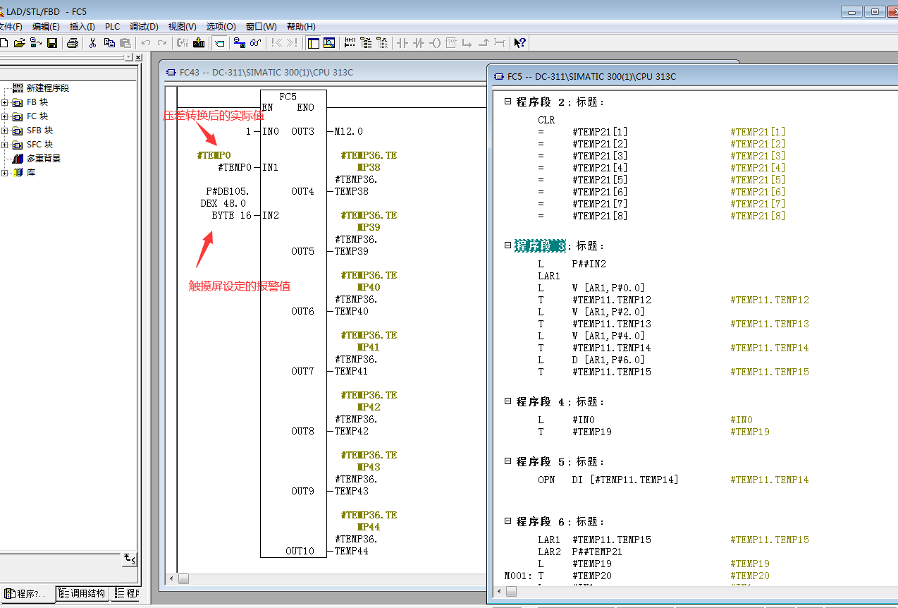 公司是外企,10年前老外寫的程序,就是一個(gè)除塵器的控制程序,除塵器有4個(gè)倉室,目前的工藝是只要其中任何一個(gè)倉室的壓差高于2000,就會(huì)停風(fēng)機(jī),現(xiàn)在公司要求呢,改為A B C D都為2000時(shí)停風(fēng)機(jī),由之前的并聯(lián)關(guān)系,改為串聯(lián)關(guān)系。但是這個(gè)程序用STL和FBD寫的,我實(shí)在看不懂,也無法轉(zhuǎn)換成梯形圖,我梳理了一下圖紙和IO地址,把差壓表的地址和觸摸屏停機(jī)值設(shè)定的地址,都寫到紙上了,大家下載這個(gè)程序看看,從哪里入手改程序,從FC5里改嗎?沒有看懂,謝謝