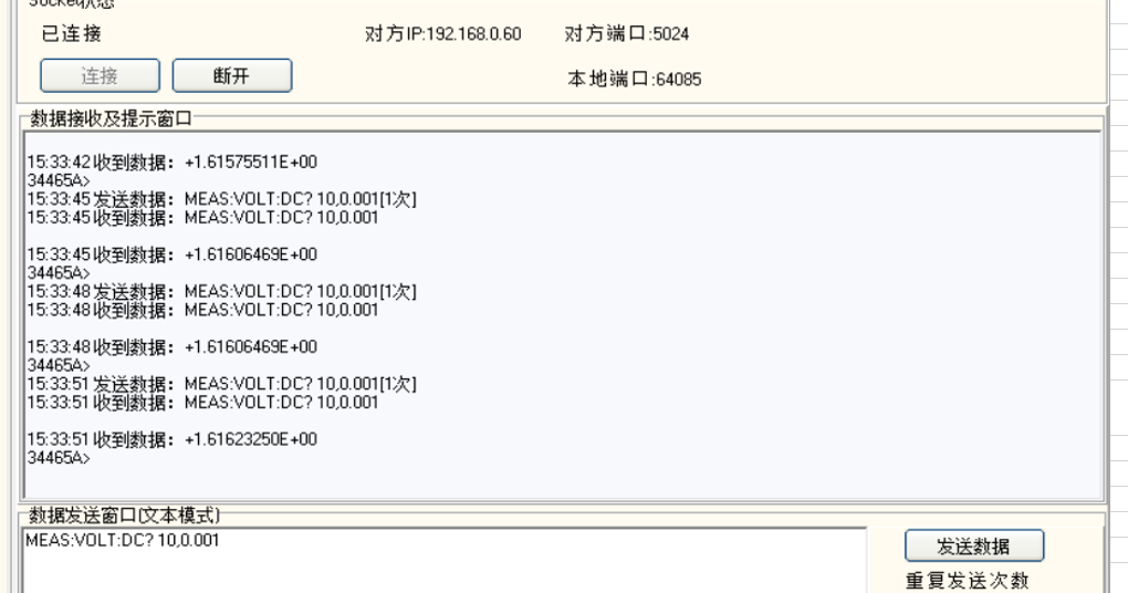第二個(gè)坑,我們直接發(fā)送“MEAS:VOLT:DC? ”是不可以的,需要加換行符,最后發(fā)送的字符串是'MEAS:VOLT:DC?$R$L',這樣才可以。