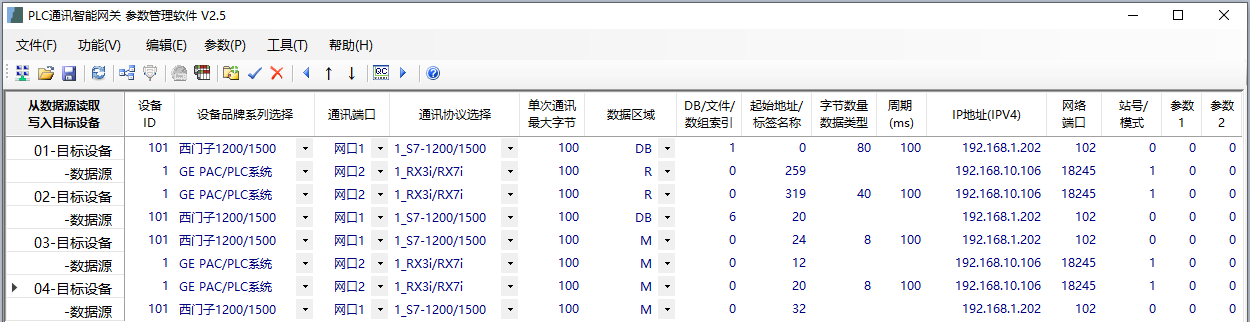 工業(yè)自動化領(lǐng)域的智能網(wǎng)關(guān)IGT-DSER模塊支持西門子、三菱、歐姆龍、羅克韋爾、GE等各種品牌的PLC之間通訊(相關(guān)資料在附件中),同時也支持PLC與Modbus協(xié)議的工業(yè)機器人、智能儀表等設(shè)備通訊。網(wǎng)關(guān)有多個網(wǎng)口、串口,也可選擇WIFI無線通訊。無需編程開發(fā),只須配置數(shù)據(jù)的起始地址和數(shù)量即可,通訊速度快、數(shù)據(jù)量大,支持多臺PLC之間通訊,支持熱插拔,斷電重啟后自恢復(fù)運行,在實際的工程項目中應(yīng)用方便。 通過IGT-DSER的參數(shù)配置軟件(在附件中)配置PLC的通訊參數(shù),包括寄存器起始地址、數(shù)量,以及PLC的IP地址、通訊端口協(xié)議等參數(shù)。以下是西門子PLC跟GE PLC之間的通訊數(shù)據(jù)配置: ![]() 以上通訊配置表中有四個并行通訊任務(wù),具體如下: 01: 從GE的PLC的R260(從1開始轉(zhuǎn)為從0開始為R259)開始讀取40個字(80字節(jié)),寫入西門子的DB1.DBW0開始的80字節(jié); 02: 從西門子PLC的DB6.DBW20開始讀取20字(40字節(jié)),寫入GE的R320(從1開始轉(zhuǎn)為從0開始為R319)開始的20字; 03: 從GE的PLC的M193(從1開始轉(zhuǎn)為從0開始為M192,字地址為192/16=12)開始讀取4個字(8字節(jié)),寫入西門子的MB24開始的8字節(jié); 04: 從西門子PLC的M32開始讀取4個字(8字節(jié)),寫入GE的M321(從1開始轉(zhuǎn)為從0開始為M320,字地址為320/16=20)開始的8個字節(jié); 相關(guān)配置文件與軟件: ![]() |