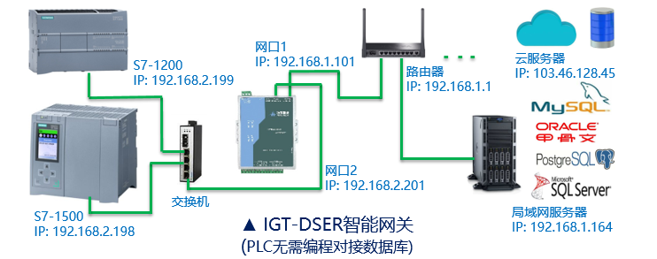 PLC不用編程,實(shí)現(xiàn)數(shù)據(jù)庫(kù)對(duì)接,完成數(shù)據(jù)采集上報(bào)與查詢。帶有數(shù)據(jù)處理和緩存功能,支持局域網(wǎng)服務(wù)器、公網(wǎng)IP服務(wù)器,以及云平臺(tái)服務(wù)器。