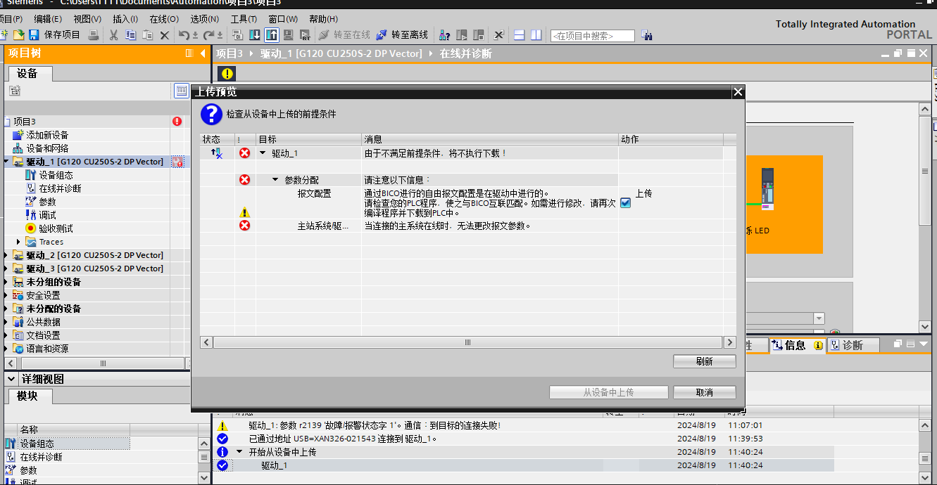 請(qǐng)問使用博途15.1讀取G120時(shí)可以連線的看到變頻器資訊,但無法從設(shè)備下載資料到電腦,