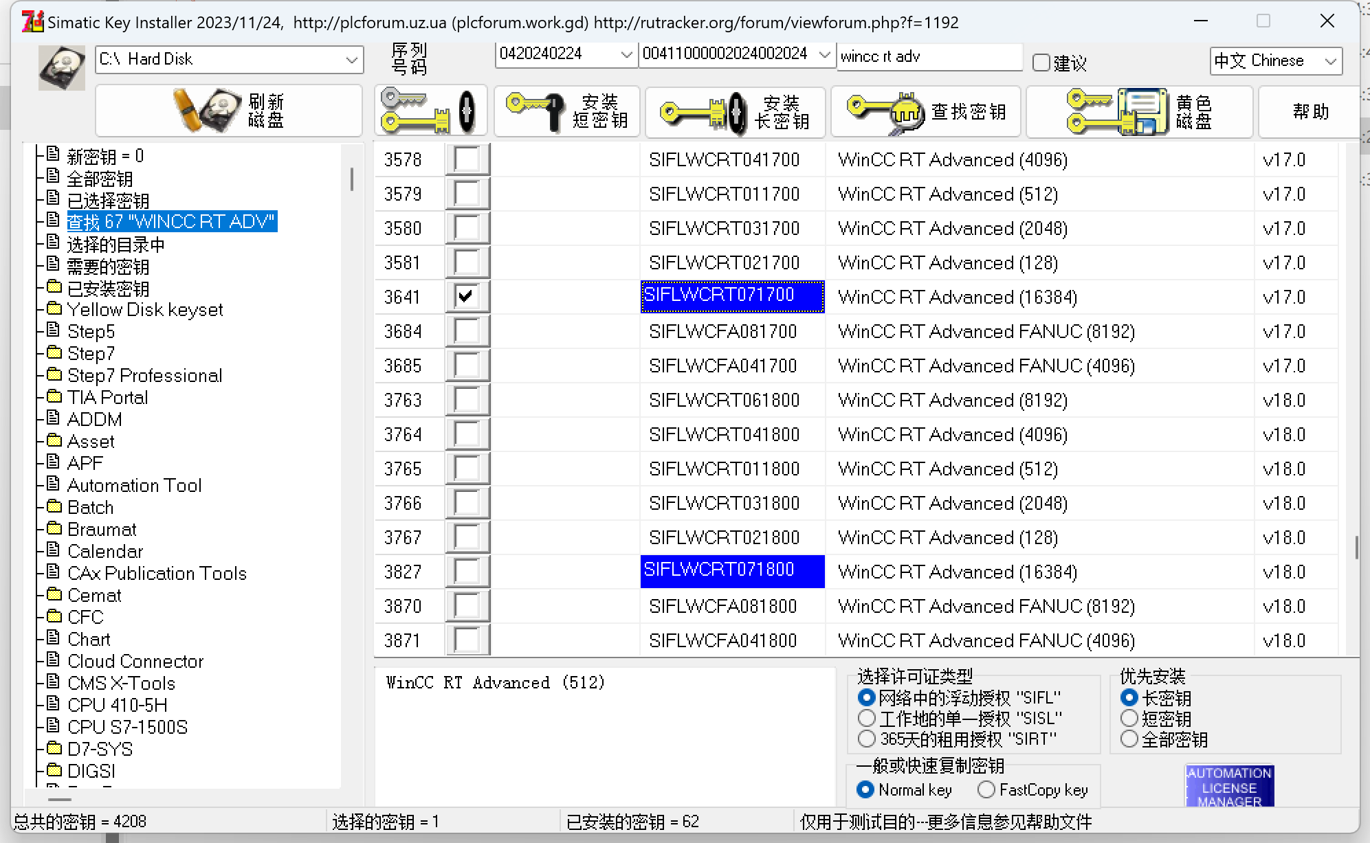 全部安裝不行,要找出最多點(diǎn)的授權(quán)安裝,多選了還是報(bào)授權(quán)錯(cuò)誤,只有PLC程序step7  、博圖可以這樣干,上位機(jī)WINCC不行,需要找到授權(quán)列表,從里面選擇最高點(diǎn)的選擇授權(quán)才行,失敗和成功試驗(yàn)多次得出的,說(shuō)多了都是淚