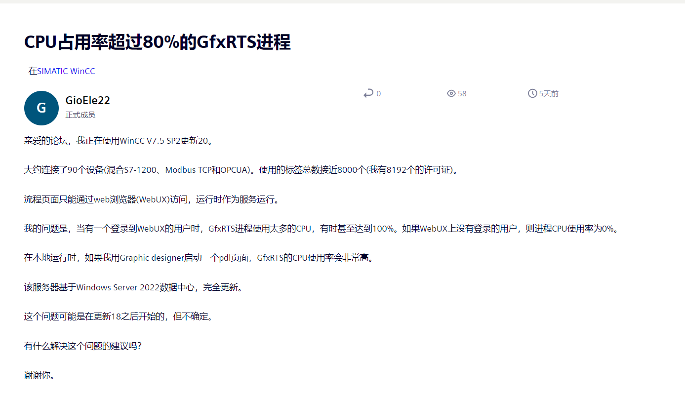 wincc7.5SP2+webux組件安裝在win10系統(tǒng)虛擬機(jī)中,有正版的授權(quán),然后升級(jí)到updata19后,發(fā)現(xiàn)虛擬機(jī)的CPU滿負(fù)荷運(yùn)行,現(xiàn)場(chǎng)有一臺(tái)第三方電腦一直訪問(wèn)這臺(tái)虛擬機(jī)服務(wù)器,有時(shí)會(huì)發(fā)生和服務(wù)器中斷連接現(xiàn)象,客戶反饋一個(gè)月有2-3次。這是什么原因。刻摂M機(jī)的配置是內(nèi)存8G CPU 2.60GHz