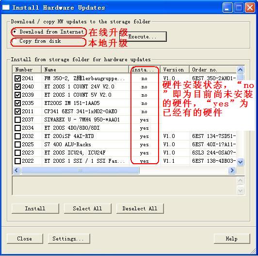 2.可以看到新版本的硬件安裝狀態(tài),標(biāo)注為“no”的是目前沒有安裝的硬件,選中前面方框,即打鉤的這些,下一步執(zhí)行的時候就會在線升級!救绻呀(jīng)下載了硬件升級文件,可以本地升級,省掉了在線下載硬件升級文件的步驟,見后文】