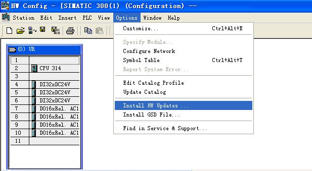 1.打開硬件組態(tài)窗口,選擇“Options”菜單下的“Install HW Updates”選項。