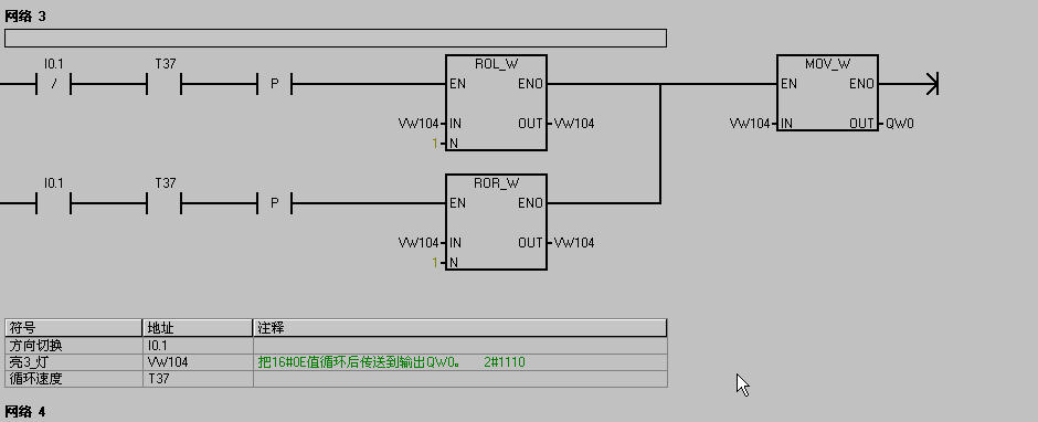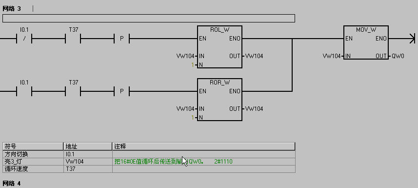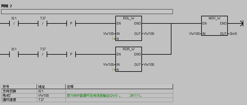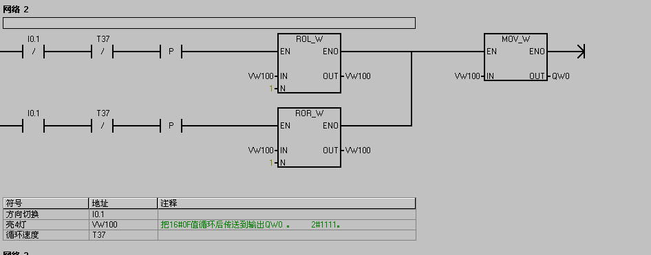 上面那個沒有分開網(wǎng)絡(luò),現(xiàn)重發(fā)一份,I0.0為開始,I0.1為循環(huán)方向轉(zhuǎn)換,數(shù)據(jù)VW100  16#0F