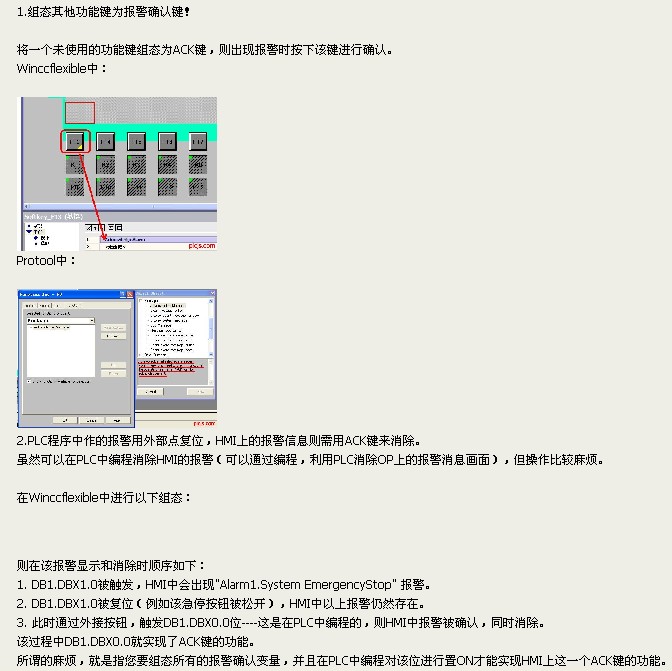 我公司機(jī)床是西門子OP27顯示屏和西門子S7-300PLC的系統(tǒng),在實際生產(chǎn)中,因顯示屏上的“ACK"報警清除鍵使用頻繁,經(jīng)常出現(xiàn)該鍵表皮破損,導(dǎo)致整個顯示屏因報警內(nèi)容擋著待機(jī)顯示的畫面無法清除,影響工藝參數(shù)的觀察與設(shè)置,我打算在S7-300PLC上用一個開關(guān)量來使用一個外接按鈕,來代替“ACK"鍵,當(dāng)按下這個按鈕時,就能清除顯示屏上的報警顯示文本。不知能不能做到,希望老師傅們幫我解決。