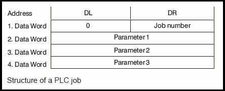 一個(gè) PLC 作業(yè)包含 4 個(gè)數(shù)據(jù)字。第一個(gè)數(shù)據(jù)字包含作業(yè)號(hào)。根據(jù)所指定的作業(yè)號(hào)功能,最多可以在數(shù)據(jù)字 2 到 4 中傳入 3 個(gè)參數(shù)。下圖顯示了該數(shù)據(jù)結(jié)構(gòu)。