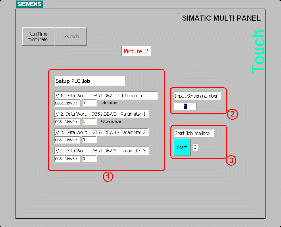 * 通過(guò)控制器將希望調(diào)用的畫面編號(hào)輸入作業(yè)信箱的第二個(gè)數(shù)據(jù)字( DB51.DBW2 )。如果需要,還可以在作業(yè)信箱的第四個(gè)數(shù)據(jù)字 ( DB51.DBW6 ) 中輸入畫面中相應(yīng)的域號(hào)。