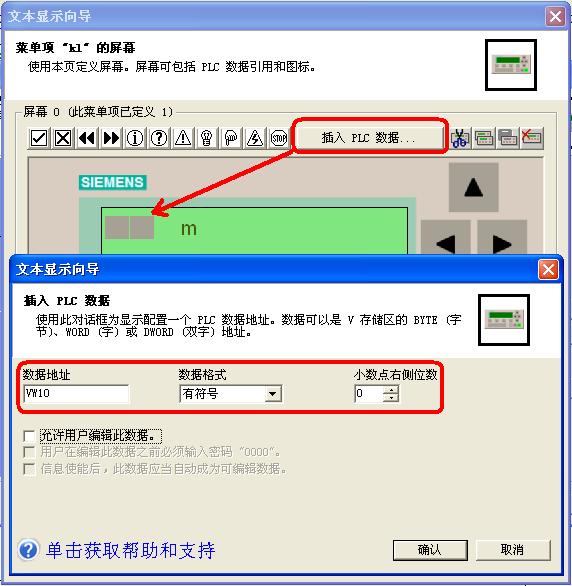 用“插入PLC數(shù)據(jù)”就可以調(diào)出填寫(xiě)具體數(shù)據(jù)的對(duì)話(huà)框,在這里你可以設(shè)置VB,VW或VD等,以及其詳細(xì)內(nèi)容。