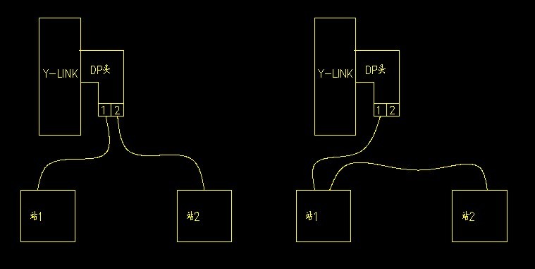 按照西門子profibus-dp協(xié)議只能是右圖能夠通訊。同時需要把Y-LINK;站2的DP頭終端電阻開關(guān)打到ON位置。