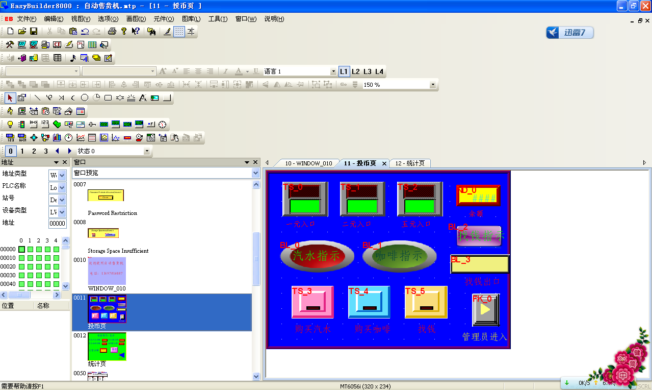 如圖的“管理員進入”要求按一下之后彈出密碼輸入窗口,輸入密碼后進入下個窗口,新手學(xué)習(xí)中,望前輩們指教。O(∩_∩)O謝謝。屏是維綸MT6056IV的。