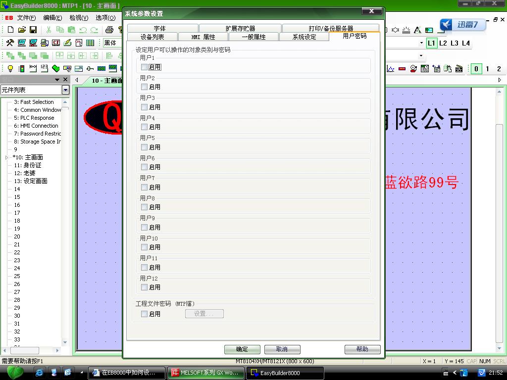 建議到威倫通的網(wǎng)站 http://www.weinview.cn/ 在[下載中心]有一個關(guān)于用戶/密碼方面的例程, 下載參考一下. 我之前也是參考的. 如果有PLC連接, 可以使用PLC控制做. 如果沒有, 可以使用功能鍵, 用[通知]觸發(fā).前提是密碼正確時需要設(shè)置某地址變量. 威綸通比較好就是用戶列表及密碼是有寄存器的, 如果用戶列表及密碼沒有寄存器(某些品牌HMI), 則或者可以嘗試使用"配方"來做. 之前我做了一個, 就是通過配方來做. 不使用觸摸屏編程軟件中的那些[用戶]及[安全]項.