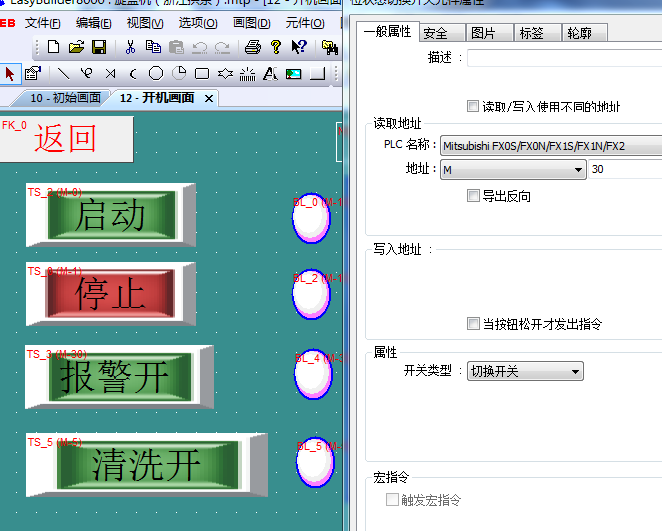 可以是同地址也可以不同地址,比如是m100,那么m100接通時(shí)該按鈕顯示綠色,未接通時(shí)顯示紅色,不同時(shí):比如m100接通是y1輸出電機(jī)啟動(dòng),那么寫(xiě)入地址是m100,讀取地址是y001。y001接通時(shí)按鈕綠色,如果電機(jī)碰到行程開(kāi)關(guān)y001停止就顯示紅色,哪怕是m100繼續(xù)接通也是紅色
