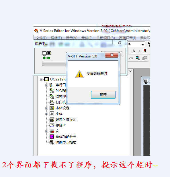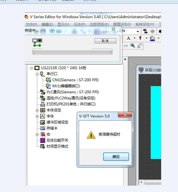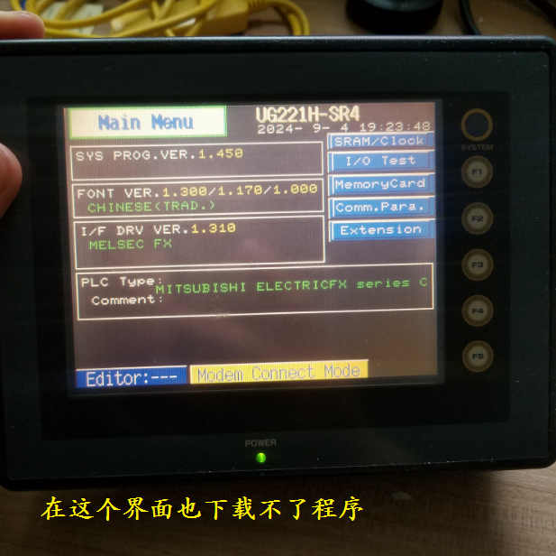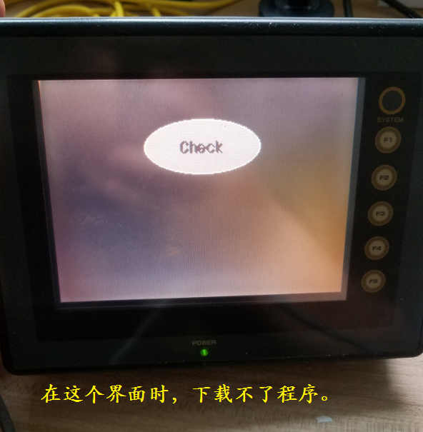 手里一個富士的觸摸屏,型號是UG221H-SR4。通訊線制作完畢,連接觸摸屏的MJ1接口,軟件下載時總是提示超時,電腦和軟件通訊參數(shù)設置一致,就是不能下載,拿下SYS+F1觸摸屏沒有反應,但是按下SYS+F5會跳出上面的系統(tǒng)畫面。系統(tǒng)菜單有SYS和F的功能鍵測試,我按下了右側的功能鍵都好用。。。