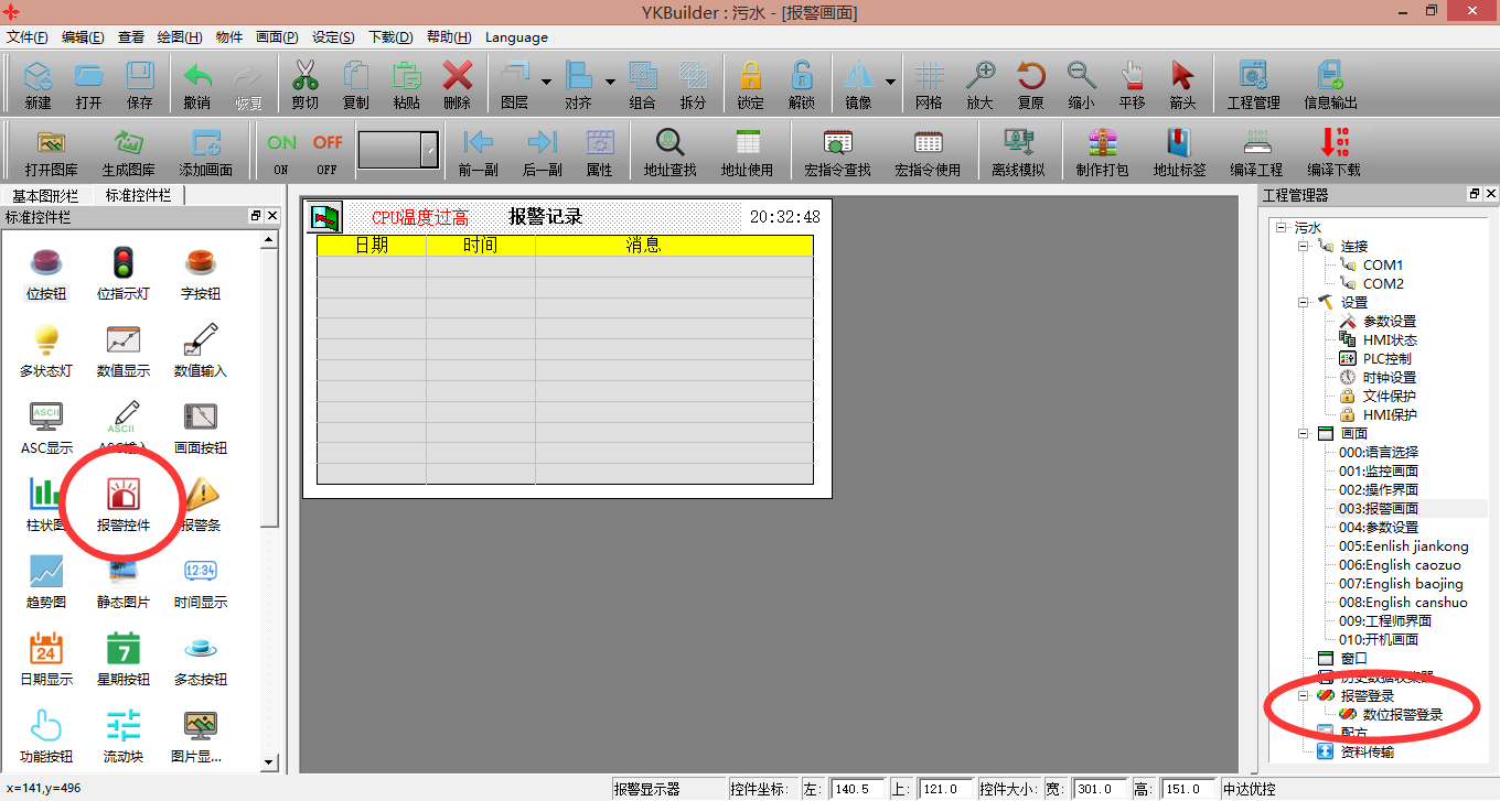 報警控件添加報警顯示框。數(shù)位報警記錄添加報警信息