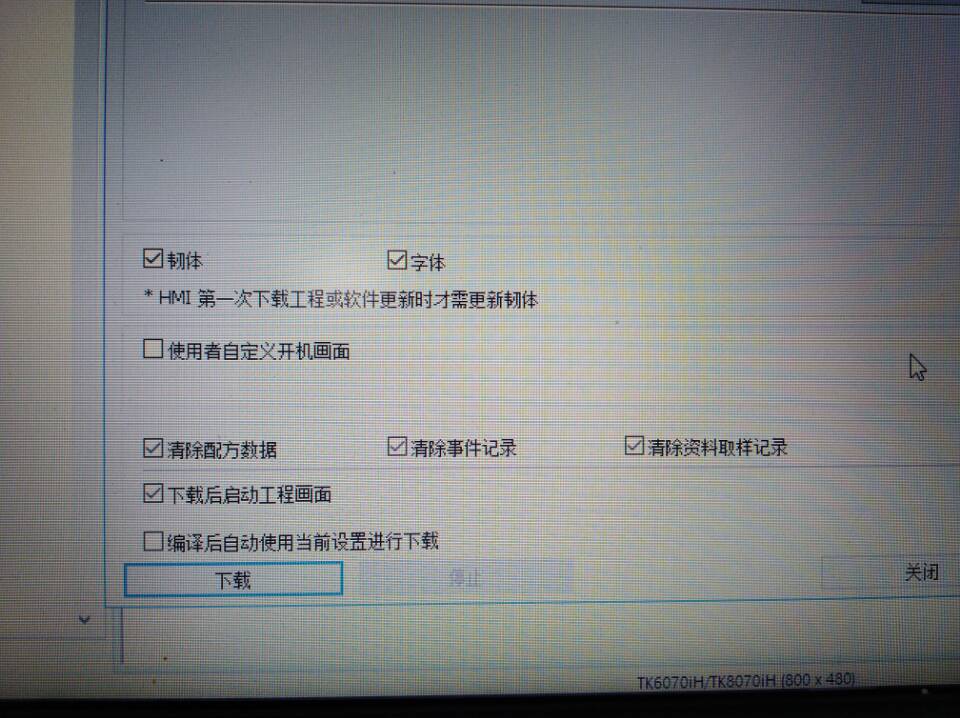 終于,在又一次下載實(shí)驗(yàn)時,發(fā)現(xiàn)下載界面上有一個下載選項(xiàng)沒有點(diǎn)選,那個下載選項(xiàng)是“韌體”,后面有說明“HMI第一次下載工程或軟件更新時才需要更新韌體”,結(jié)果點(diǎn)選這個韌體選項(xiàng)下載后,一切正常了。