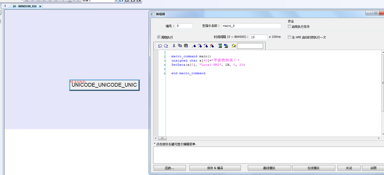 如圖所示,宏指令寫入內容,顯示中文