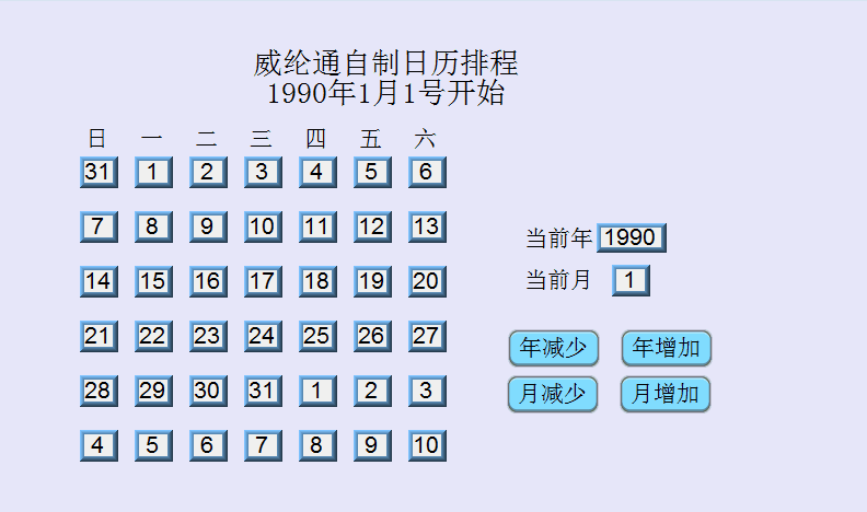 具體思路,1先計(jì)算你想要的日期距離1990年1月相差的天數(shù),然后輸入1990年1月1號(hào)的星期,就可以得到當(dāng)前月的星期(包含閏年)
