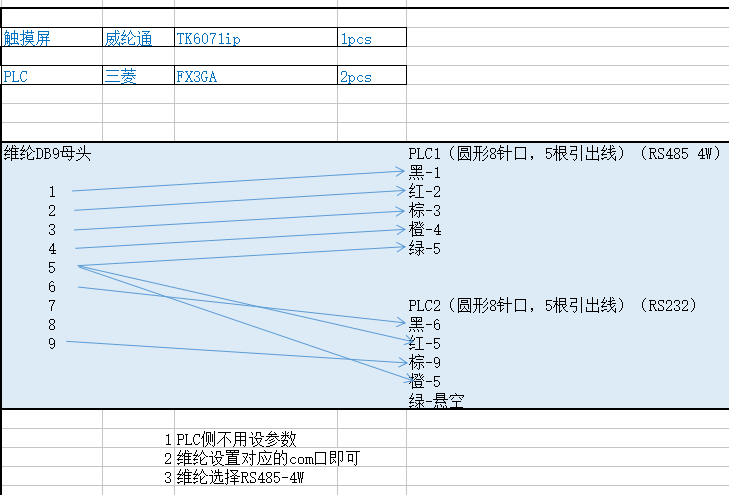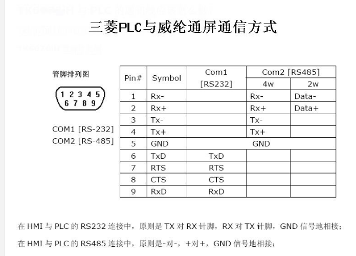 ![]() 我現(xiàn)在有一臺威綸通 TK6071ip 的觸摸屏,只有一個通訊用的DB9接口,但是里面包含的 com 1 和com2 兩個接口,一個支持485 一個支持232, 現(xiàn)在分別想用這2個通訊分別連1臺三菱FX3GA 的PLC ,相當(dāng)于是1屏2 PLC,這樣的,目前用485口的與PLC通訊正常,就是支持232的這個口一直連不上,用了一個232轉(zhuǎn)422的轉(zhuǎn)換頭,不知道該怎么接線。PLC這邊是圓形8針的,求大神指點(diǎn)! ![]() ![]() |