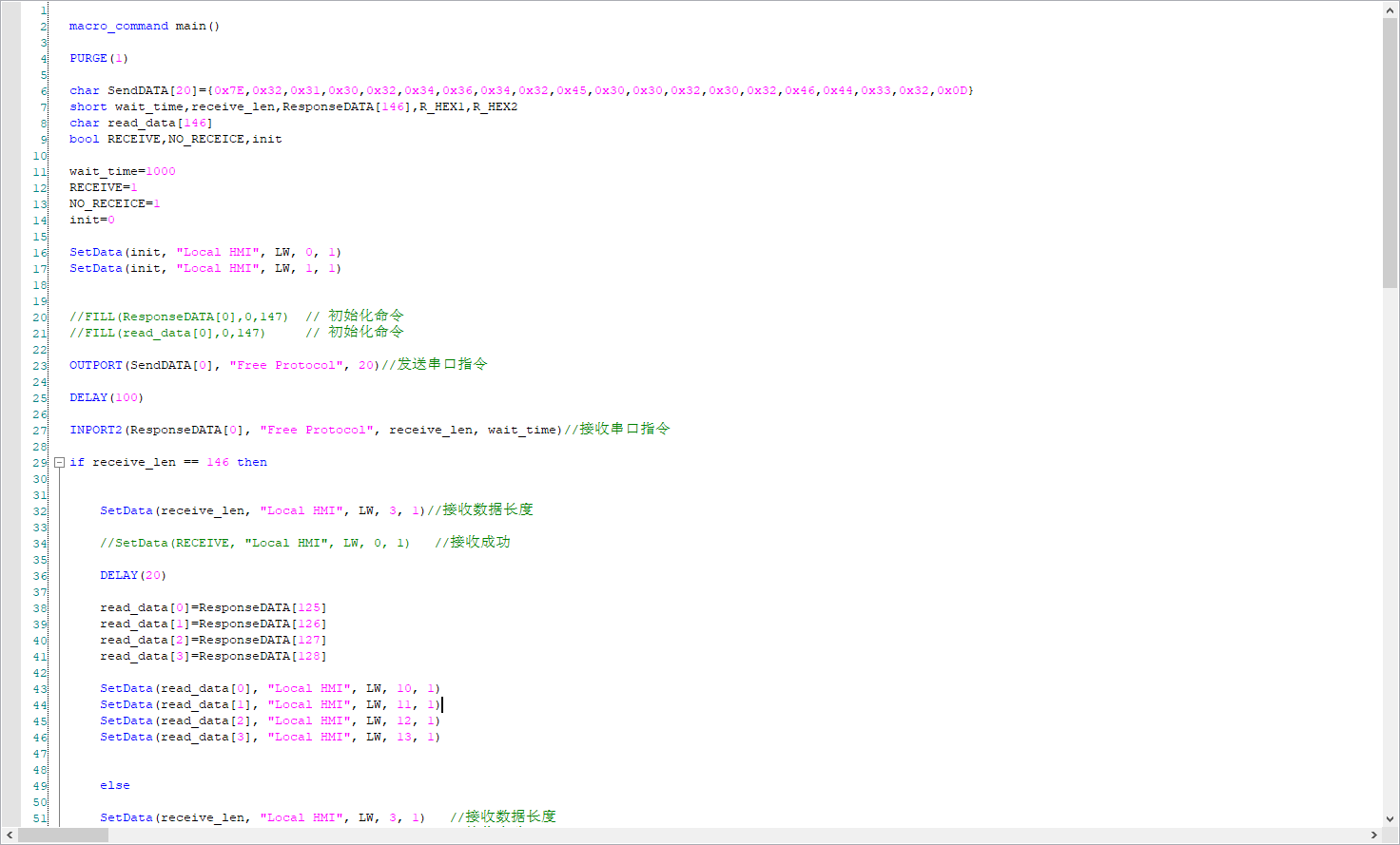 求助大神們,我用威綸通自由協(xié)議通訊發(fā)送指令,但返回的數(shù)據(jù)顯示為0,目前確認指令發(fā)送成功(用串口助手試了),接收數(shù)據(jù)長度沒問題,想問下如何解決。圖片分別為宏指令程序,觸摸屏數(shù)值顯示格式設置,用串口助手發(fā)送指令和接收到的數(shù)據(jù)。