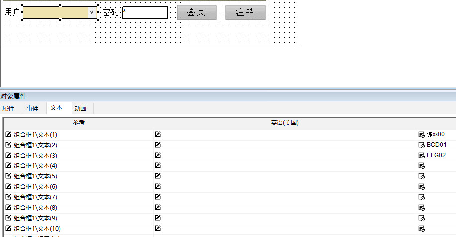 做出來的效果,就是在ComboBox的下拉列表中選中其中一個用戶名【陳xx00、BCD01、EFG02】,然后點擊登陸。前提是這些用戶必須已經(jīng)存在,且增加用戶時,需要修改ComboBox的文本
