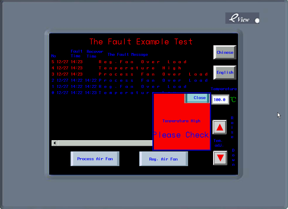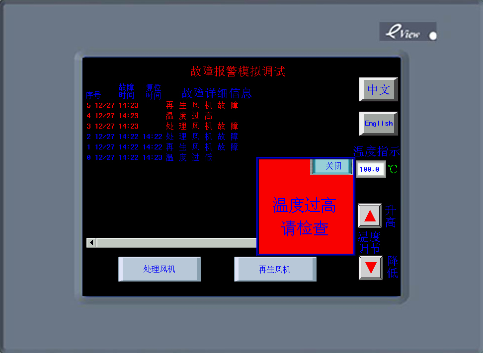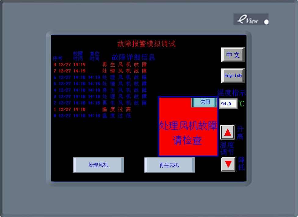 最近做了個故障報警模擬調(diào)試界面,是用eview的MT5400T做的,拿來和大家分享一下,不足之處請指正。