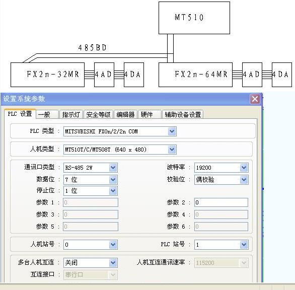 如圖所示:我用人機連接兩臺FX2n PLC,參考手冊我采用兩種方式: