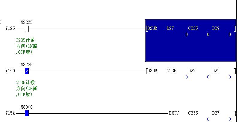 M8235為接通時單向高速計數(shù)器C235為減計數(shù)模式,緊跟后邊的【 DSUB D27 C235 D29]是用D27里的數(shù)值減去C235里的數(shù)值,等于的數(shù)值存放在D29里。M8235為斷開時C235是增計數(shù)模式,緊跟后邊的【DSUB C235 D27 D29]的意思是用C235的數(shù)值減去D27里的數(shù)值,等于的數(shù)值存放在D29里。注意DSUB為32位的減法指令,不加D就是16位的。M8000就不說了。最后一行的意思是把C235里的數(shù)值傳送到D27里(應該是顯示樓層數(shù)的)。