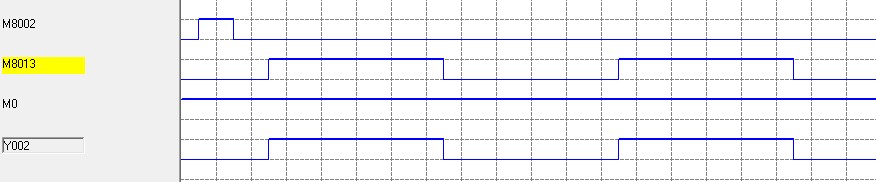PLC在從OFF變?yōu)镺N時(shí),輸入輸出都為OFF,只在從OFF變ON時(shí),M8002輸出一個(gè)掃描周期的脈沖,但是在第一個(gè)掃描周期內(nèi)M8013是低電平,所以M8013慢一個(gè)掃描周期