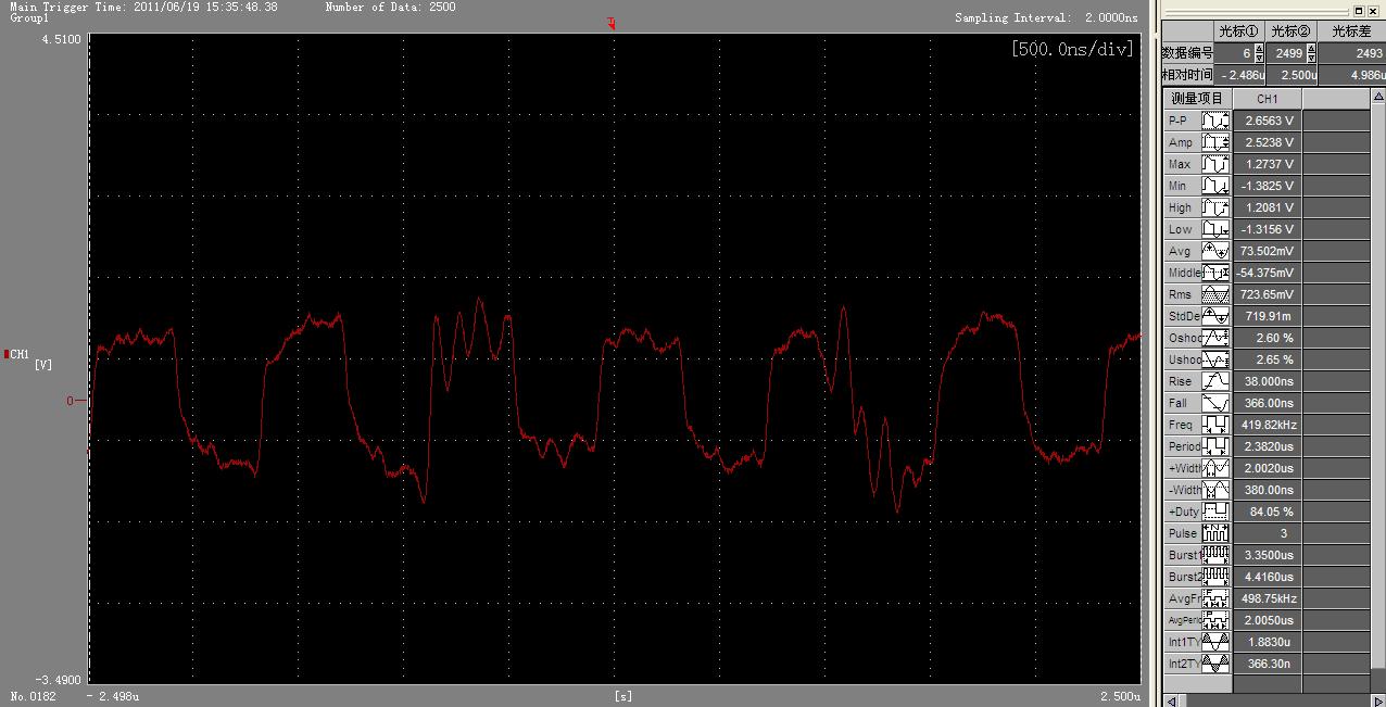 所致。用示波器測(cè)量該變頻器端的CC-LINK通訊信號(hào),發(fā)現(xiàn)確實(shí)衰減很大,而且波形雜亂: