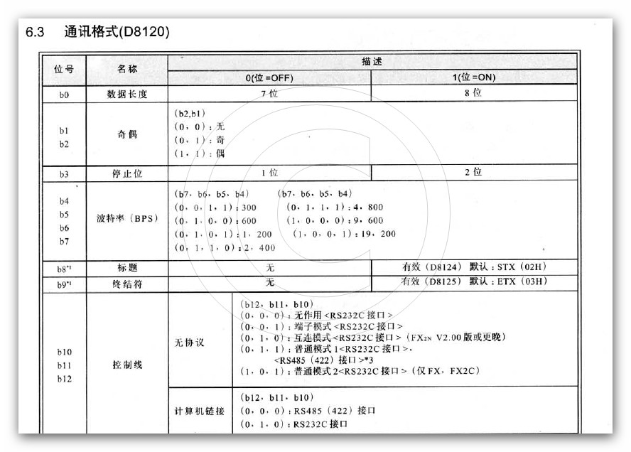 《B15- B0> 把這些二進(jìn)制帶入上就可以知道是什么功能了,H0C88實(shí)現(xiàn)的功能是7位數(shù)據(jù)長(zhǎng)度(即7'N'2),無(wú)奇偶數(shù),2位停止位,波特率是9600,標(biāo)題和終結(jié)符無(wú),控制線是無(wú)協(xié)議,普通模式RS232接口(。RS485。RS422接口),使用RS 指令,希望你能理解