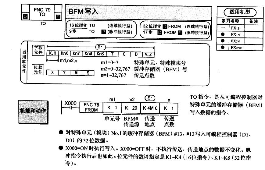 TO:BFM寫入指令。使用該指令時,必定有特殊功能擴(kuò)展模塊。該指令即對特殊模塊的BFM區(qū)寫入數(shù)據(jù),以對其參數(shù)進(jìn)行設(shè)置和傳輸。