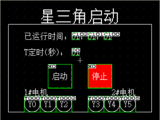 (1)按下觸摸屏上的“啟動(dòng)”按鈕,1#電機(jī)Y啟動(dòng),1秒后,1#電機(jī)△啟動(dòng);相隔T秒后,2#電機(jī)Y啟動(dòng),1秒后,2#電機(jī)△啟動(dòng)。