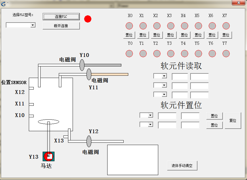 這個是模擬兩種液體經(jīng)電磁閥Y10 和Y11流入,然后馬達攪拌,再經(jīng)過電磁閥Y10流出,可以自己用GX編程控制電磁閥和馬達運轉(zhuǎn),GX也可以接受到SENSOR輸入信號。