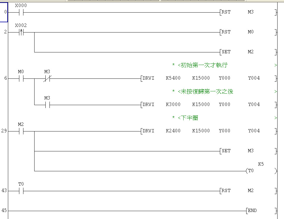 初始啟動(或者按了x0之後)啟動了m0時,伺服馬達前轉(zhuǎn)會走k5400,碰到x2之後會走k2400回來,