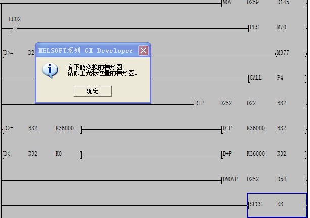 程序是從設備拷貝出來的,不做任何修改都不能轉換!請大家?guī)兔纯矗?br />光標處的SFCS是什么指令?軟件輸不了這條指令,只有刪掉這條指令才可以轉換!