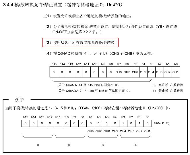 這是典型的16個(gè)位啊,每個(gè)位代表一個(gè)通道,從左到右是B15 B14 B13....B0,B0代表通道1(CH1),如想全部開通8個(gè)通道,那么B15  B14  B13  B12  B11  B10 B9 B8的值全部為1(禁止模數(shù)轉(zhuǎn)換),B7 至B0就設(shè)0(允許模數(shù)轉(zhuǎn)換)。你打開電腦的計(jì)算器,選擇查看--科學(xué)型,再選擇二進(jìn)制(單字)按排列順序填入1 1 1 1 1 1 1 1 0 0 0 0 0 0 0 0,再選擇十六進(jìn)制,那么對(duì)應(yīng)的十六進(jìn)制數(shù)值就出來了FF00,你直接寫成TO H0 K0 HFF00  K1就可以了。